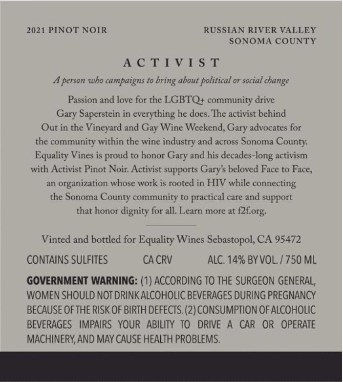 Following the rosé, we moved on to Activist Pinot Noir. This wine’s namesake reflects Equality Vines’ mission to support activists in the LGBTQ+ community, with a portion of the proceeds going to their causes. This particular bottle honors Gary Saperstein, founder of Out in the Vineyard and Gay Wine Weekend. A tireless advocate for the LGBTQ+ community in the wine industry and Sonoma County, Gary’s work is supported by sales of Activist Pinot Noir, which benefits Face to Face, an organization providing HIV care and community support with dignity